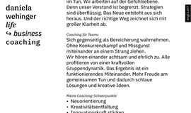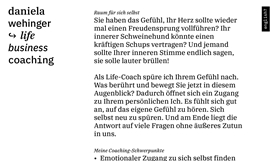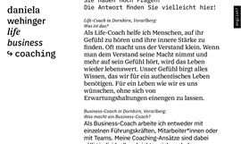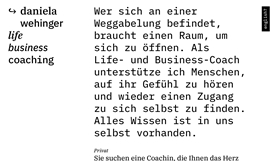 Immer wieder im Laufe unseres Lebens stehen wir vor der Entscheidung. Links oder rechts? Die richtige Richtung einzuschlagen, ist oft eine Herausforderung. Daniela Wehinger unterstützt im Privat- und Businessbereich, in sich hineinzuhören und den Sprung nach vorne zu wagen. Typografie wirkt auf uns und kann uns gedanklich in eine Richtung lenken.